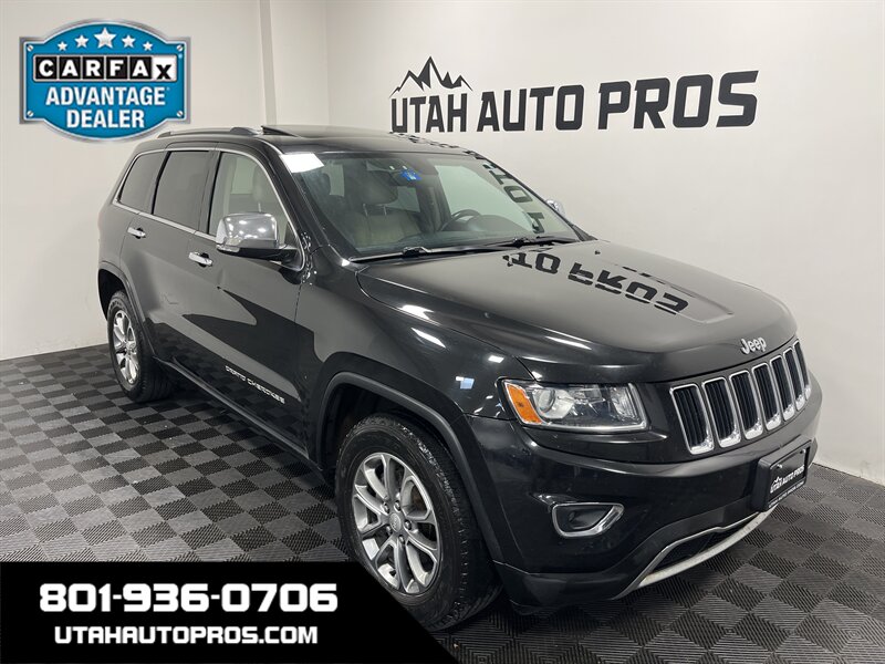 GRAND CHEROKEE LIMITED!!! This is a great looking Jeep Grand Cherokee Limited in a brilliant black with tinted windows and a tan leather interior. It is nicely equipped with navigation, backup camera, sunroof, heated seats and steering wheel, xenon headlights, bluetooth, push button start, sporty silver interior trim, power adjustable drivers seat, power lift gate, great looking alloy wheels, remote start, clean title, runs and drives great. We tend to sell our vehicles quickly so please call and verify availability before heading in. You can check out the rest of our great inventory online at www.utahautopros.com